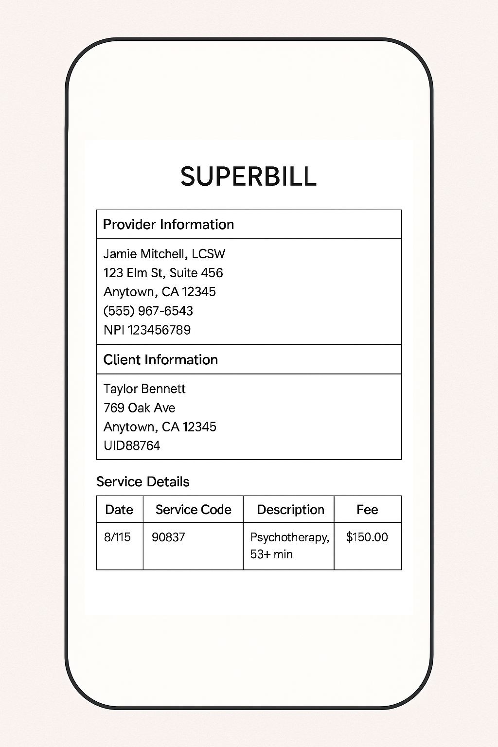 A superbill is basically an itemized receipt your therapist gives you that includes what your insurance company needs (diagnosis code, session dates, fees, etc.). You submit that receipt directly to your insurance, and if your plan covers out-of-network mental health care, they’ll reimburse you for a portion of the cost.